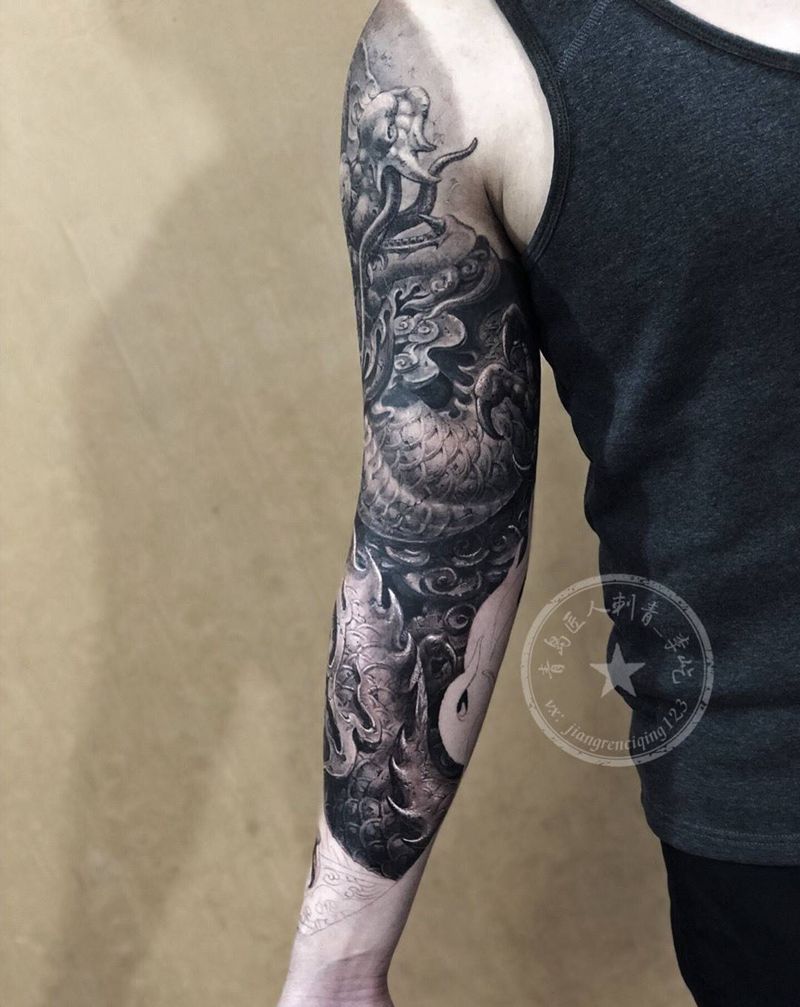 当前位置: 首页 >山东省青岛市纹身店-匠人刺青纹身图案>雕龙臂纹身图片_手臂新传统欧美写实石雕纹身图案