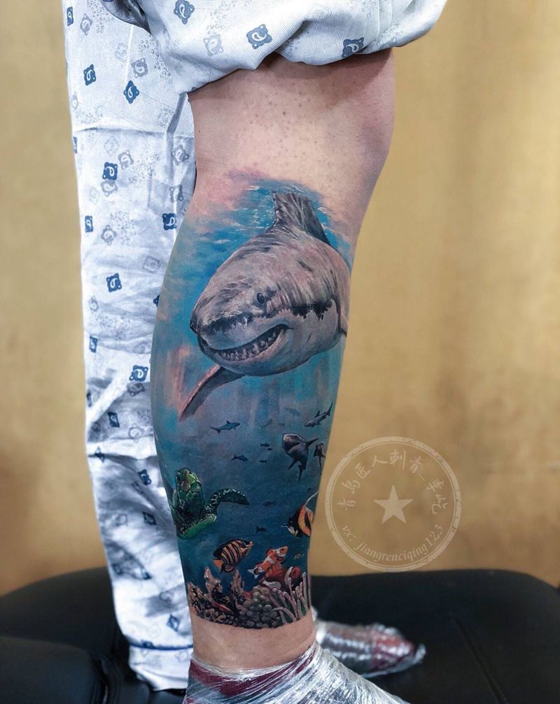 当前位置: 首页 >山东省青岛市纹身店-匠人刺青纹身图案>海底世界 鲨鱼纹身图片_腿部新传统欧美写实海底世界鲨鱼纹身图案