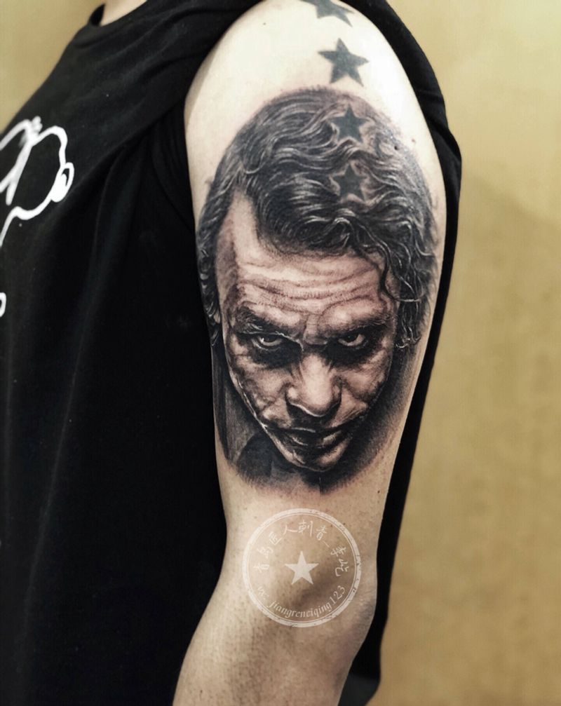 当前位置: 首页 >山东省青岛市纹身店-匠人刺青纹身图案>小丑肖像纹身图片_手臂新传统欧美写实肖像写实纹身图案