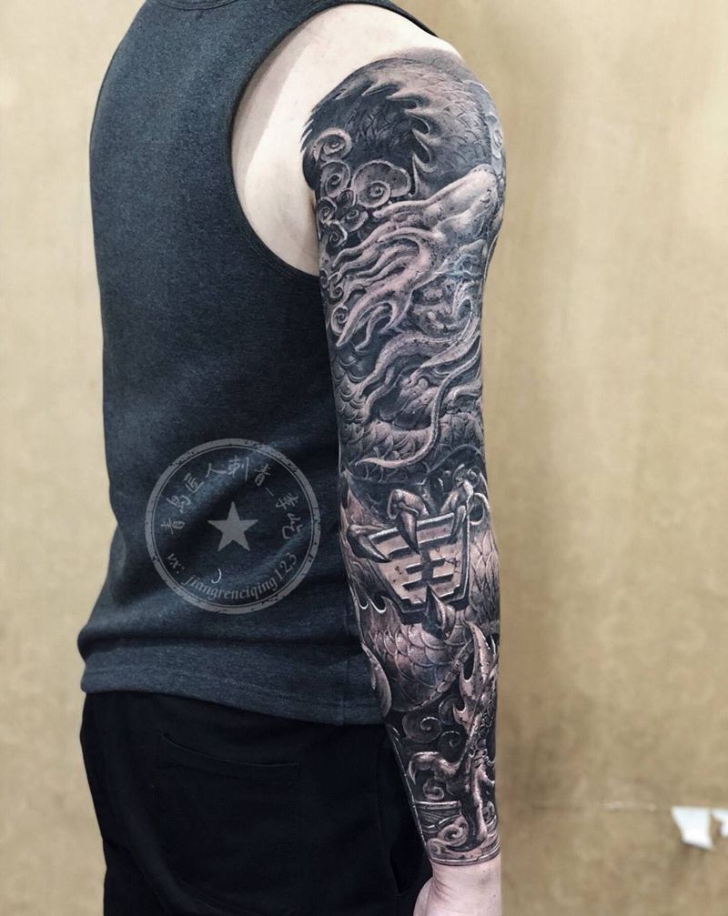 当前位置: 首页 >山东省青岛市纹身店-匠人刺青纹身图案>雕龙臂纹身图片_手臂新传统欧美写实石雕纹身图案