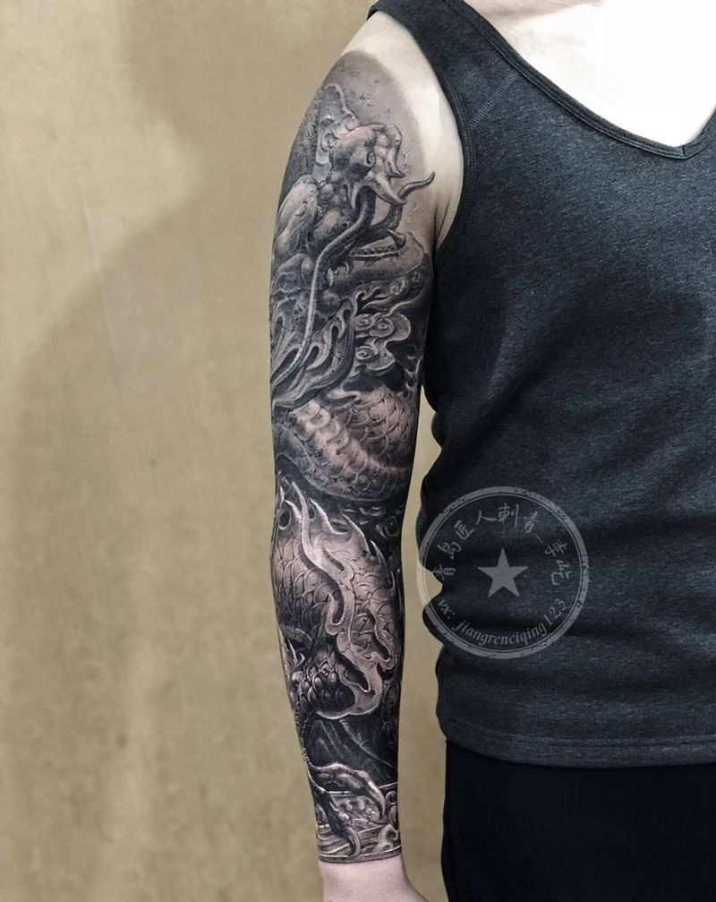 当前位置: 首页 >山东省青岛市纹身店-匠人刺青纹身图案>雕龙臂纹身图片_手臂新传统欧美写实石雕纹身图案