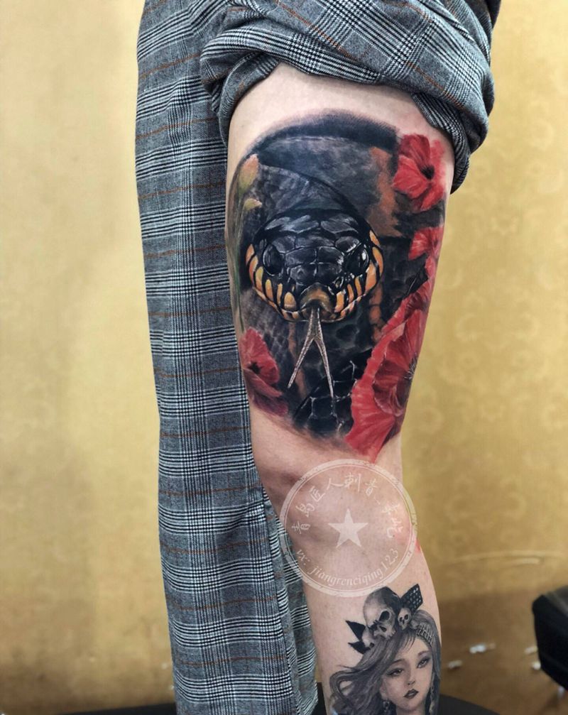 当前位置: 首页 >山东省青岛市纹身店-匠人刺青纹身图案>罂粟 蛇纹身图片_腿部欧美写实新传统罂粟蛇纹身图案