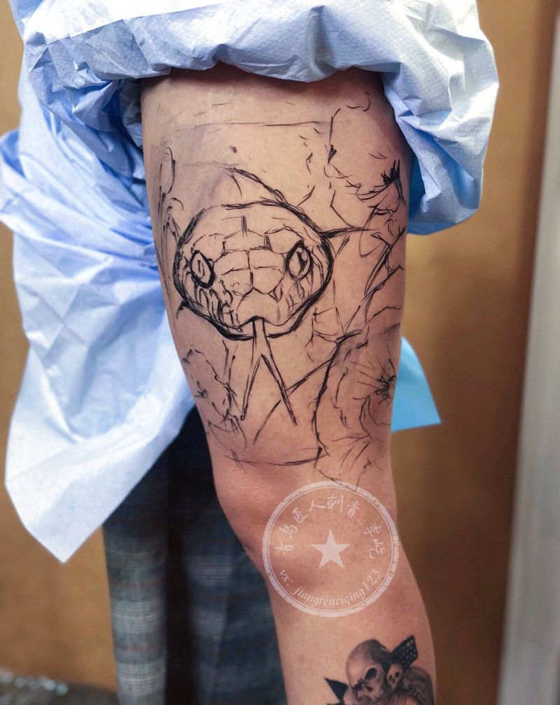 当前位置: 首页 >山东省青岛市纹身店-匠人刺青纹身图案>罂粟 蛇纹身图片_腿部欧美写实新传统罂粟蛇纹身图案