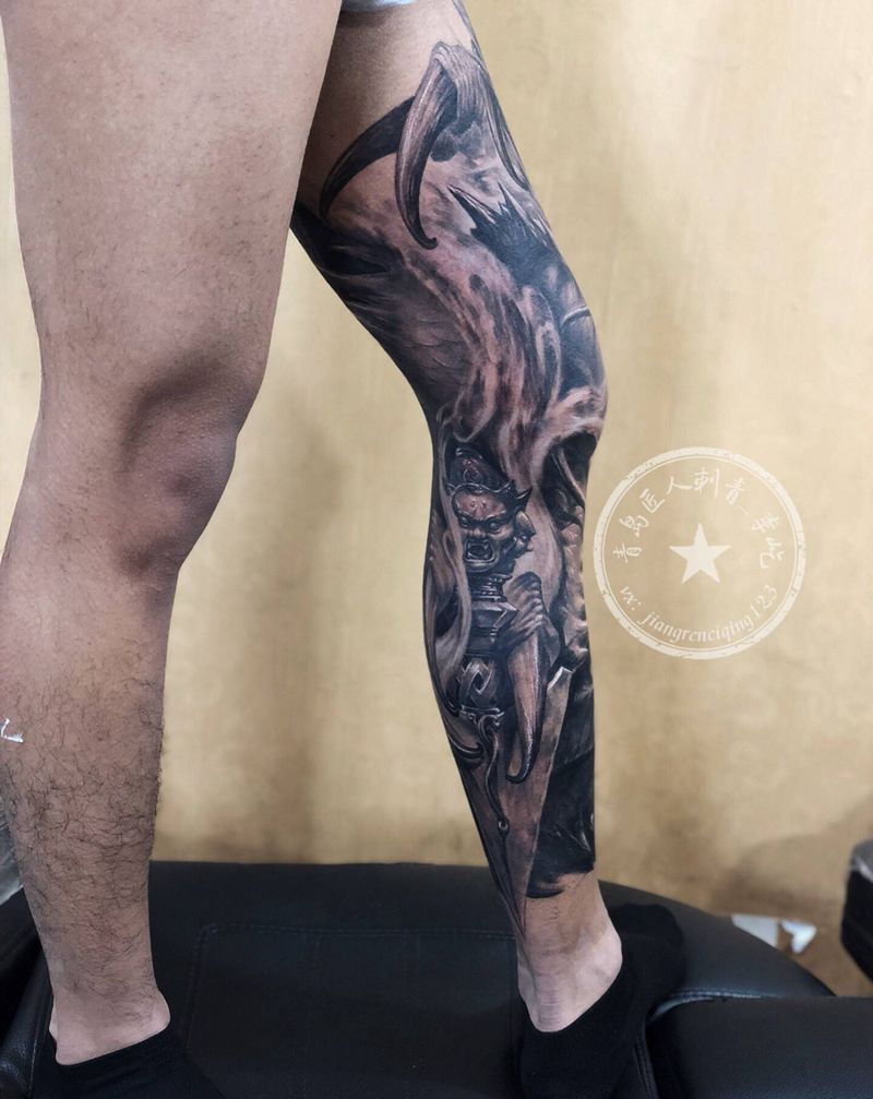 当前位置: 首页 >山东省青岛市纹身店-匠人刺青纹身图案>盘龙腿纹身图片_腿部新传统欧美写实龙花腿纹身图案