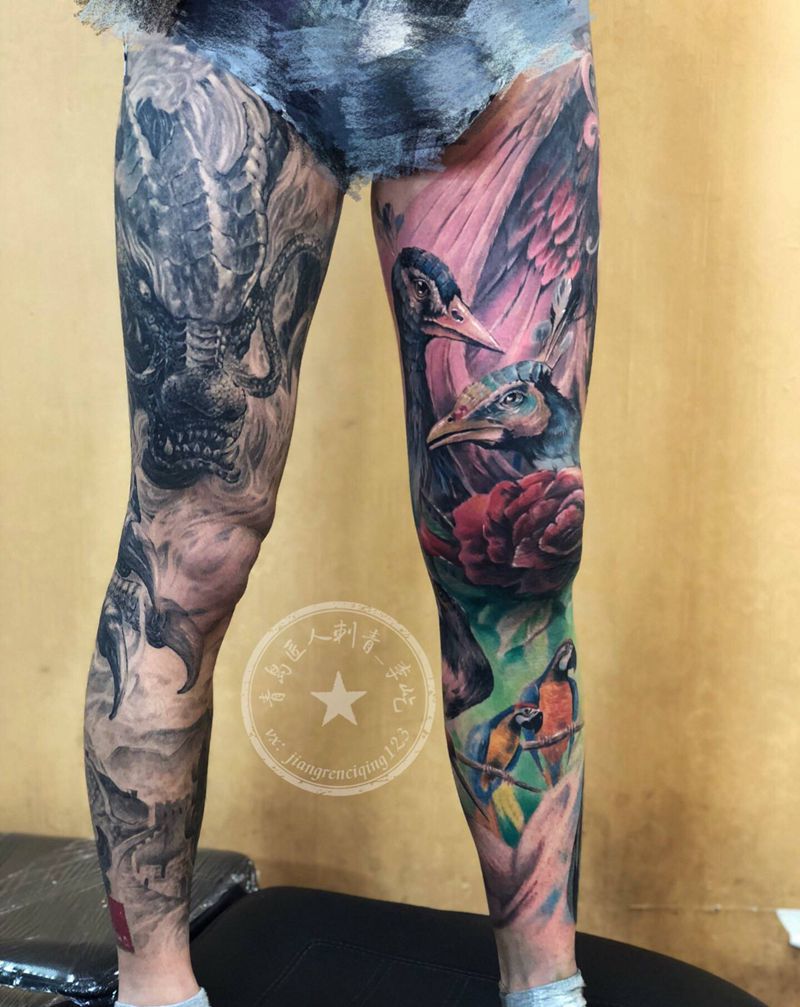 • T网红王老大花腿龙纹身图片_腿部新传统纹身图案