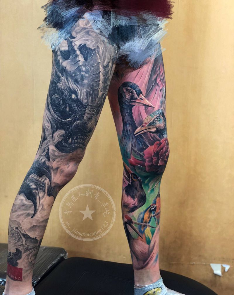 当前位置: 首页 >山东省青岛市纹身店-匠人刺青纹身图案>百鸟朝凤 凤凰纹身图片_腿部新传统欧美写实凤凰鸟纹身图案