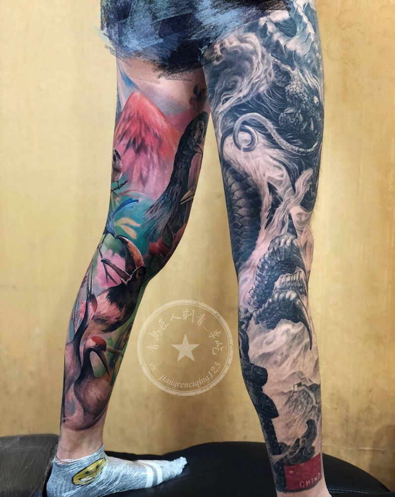 • T网红王老大花腿龙纹身图片_腿部新传统纹身图案