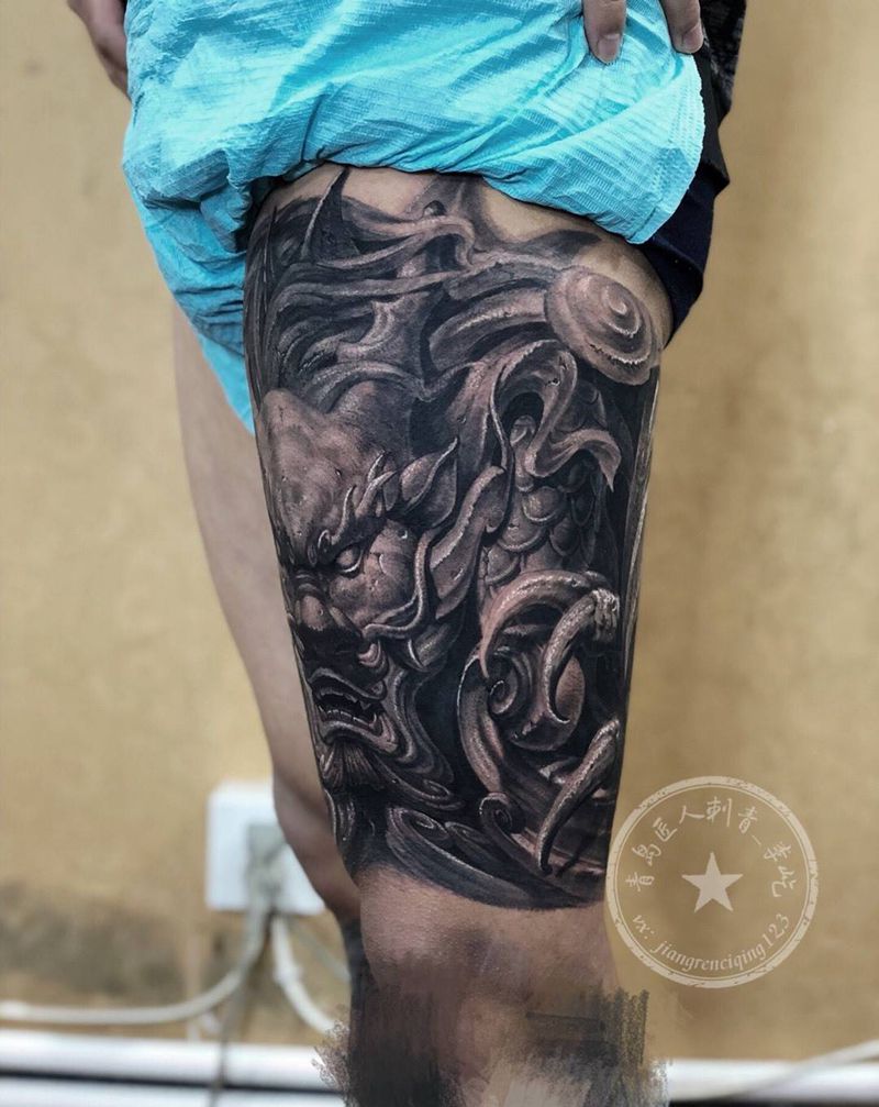 当前位置: 首页 >山东省青岛市纹身店-匠人刺青纹身图案>石雕龙 半腿纹身图片_腿部欧美写实新传统石雕龙纹身图案