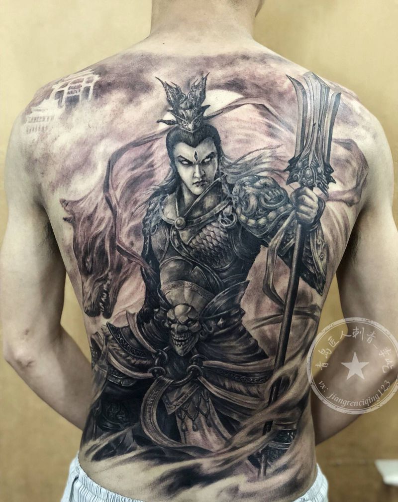 二郎真君4 二郎神 满背纹身图片_背部新传统欧美写实二郎神 杨戬纹身图案