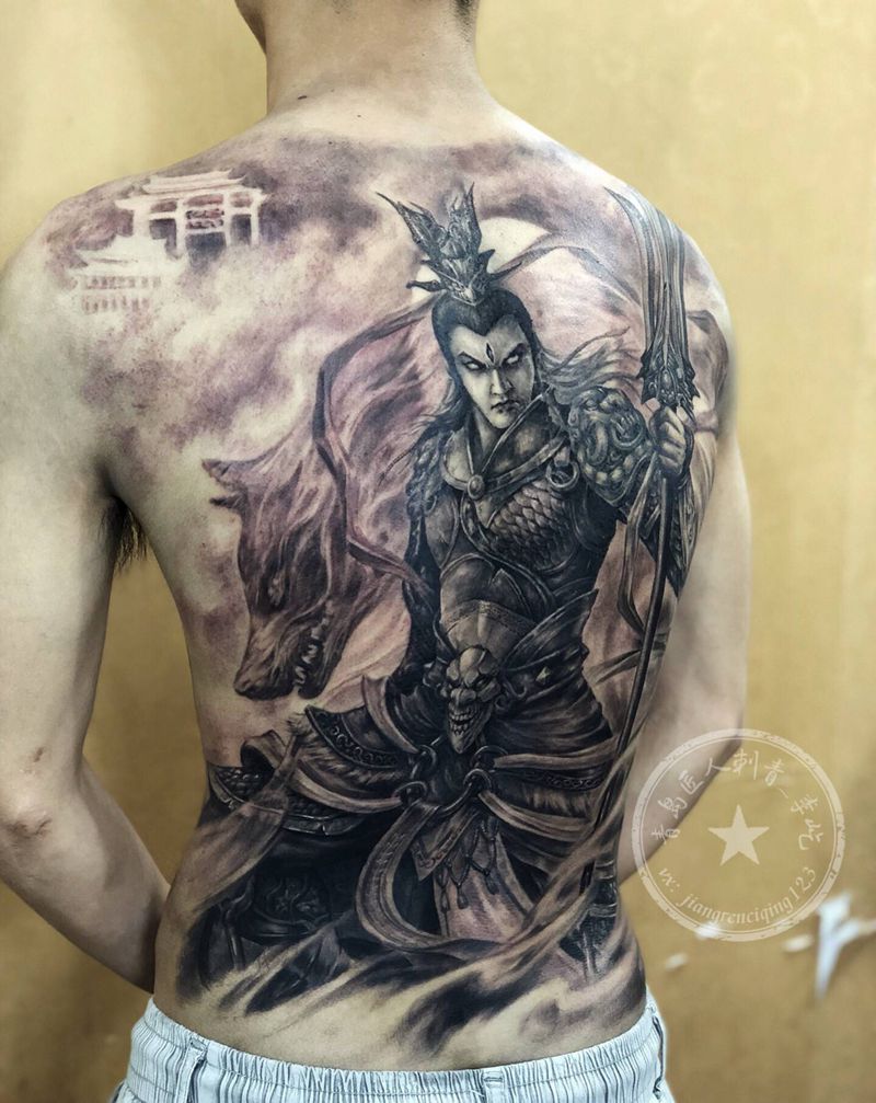 二郎真君4 二郎神 满背纹身图片_背部新传统欧美写实二郎神 杨戬纹身图案