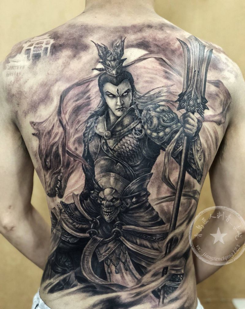 二郎真君4 二郎神 满背纹身图片_背部新传统欧美写实二郎神 杨戬纹身图案