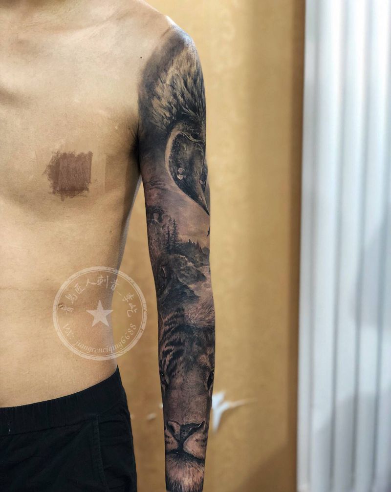 当前位置: 首页 >山东省青岛市纹身店-匠人刺青纹身图案>动物花臂纹身图片_手臂欧美写实狮子鹰老虎纹身图案