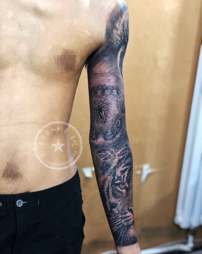当前位置: 首页 >山东省青岛市纹身店-匠人刺青纹身图案>动物花臂纹身图片_手臂欧美写实狮子鹰老虎纹身图案