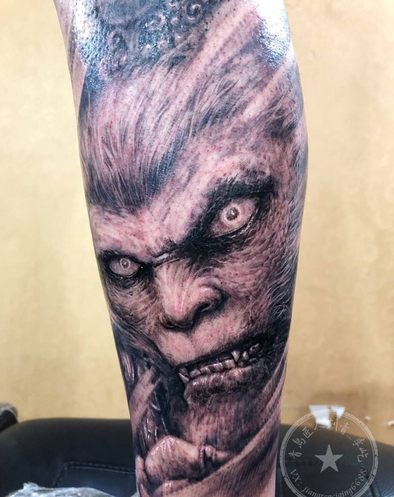 齐天大圣 孙悟空纹身图片_腿部欧美写实孙悟空齐天大圣小腿纹身图案
