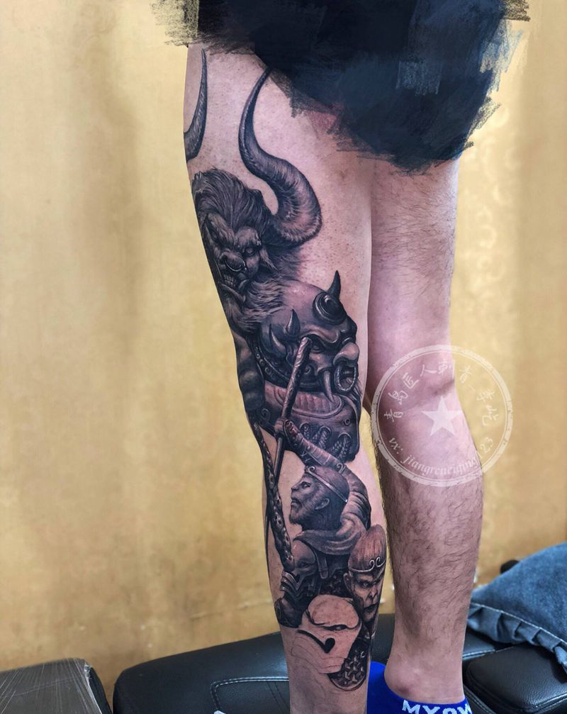 牛魔王纹身图片_腿部新传统欧美写实牛魔王孙悟空纹身图案