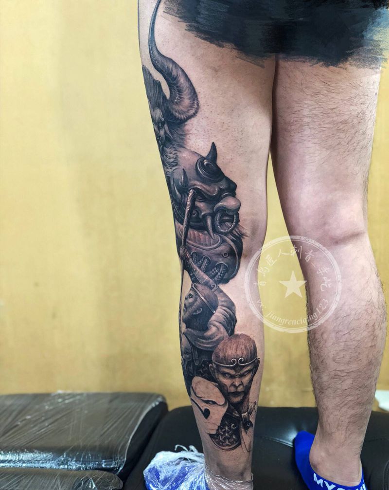 牛魔王纹身图片_腿部新传统欧美写实牛魔王孙悟空纹身图案