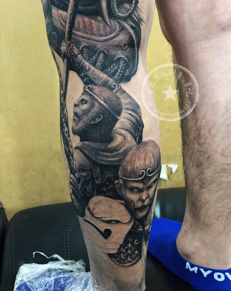 牛魔王纹身图片_腿部新传统欧美写实牛魔王孙悟空纹身图案