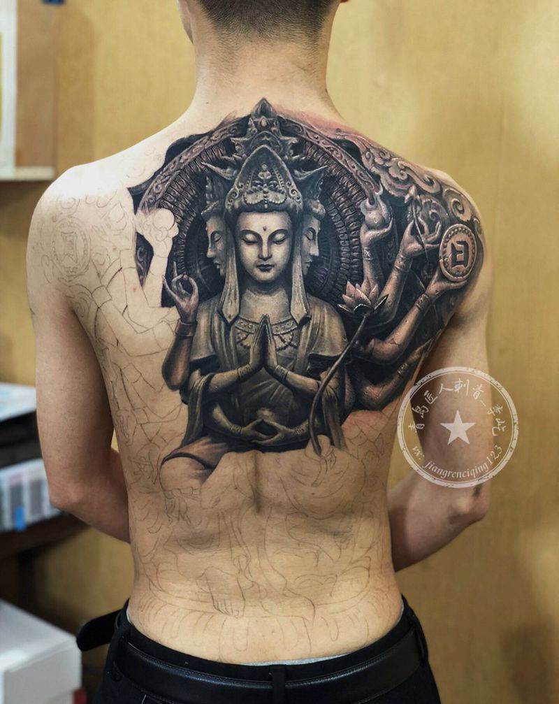 当前位置: 首页 >山东省青岛市纹身店-匠人刺青纹身图案>石雕千手观音纹身图片_背部腰部新传统欧美写实石雕千手观音纹身图案