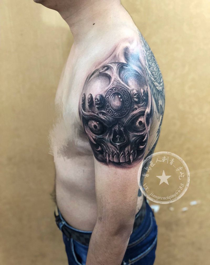 当前位置: 首页 >山东省青岛市纹身店-匠人刺青纹身图案>肩甲纹身图片_肩部欧美写实般若嘎巴拉纹身图案