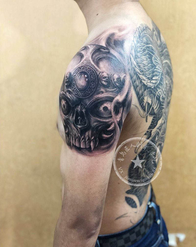 当前位置: 首页 >山东省青岛市纹身店-匠人刺青纹身图案>肩甲纹身图片_肩部欧美写实般若嘎巴拉纹身图案