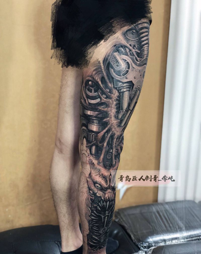 生化机械腿遮盖未完成纹身图片_腿部新传统欧美写实生化机械腿纹身图案