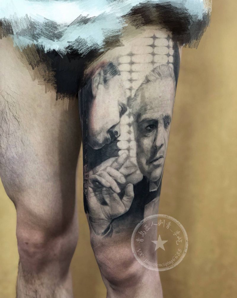 肖像花腿 教父未完成纹身图片_腿部欧美写实教父肖像花腿纹身图案