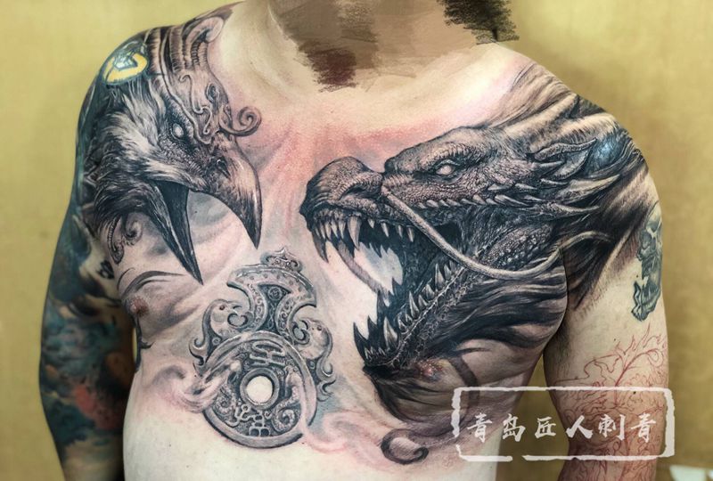 当前位置: 首页 >山东省青岛市纹身店-匠人刺青纹身图案>龙凤壁纹身图片_胸部肩部欧美写实龙凤凰纹身图案