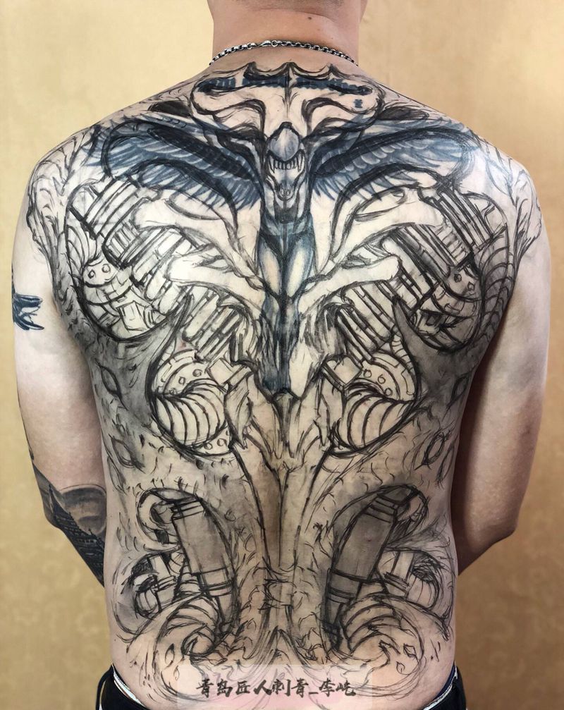 生化机械背 遮盖旧图未完成纹身图片_背部新传统欧美写实生化机械纹身图案