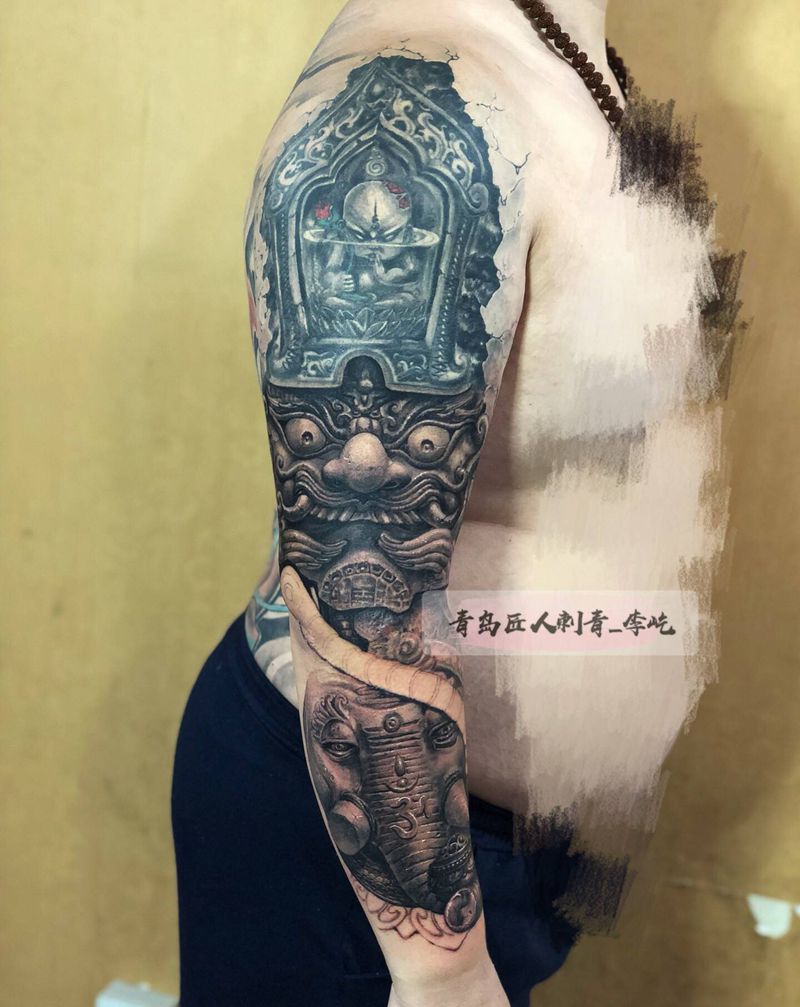 当前位置: 首页 >山东省青岛市纹身店-匠人刺青纹身图案>旧图衔接接花臂纹身图片_手臂欧美写实新传统石雕纹身图案