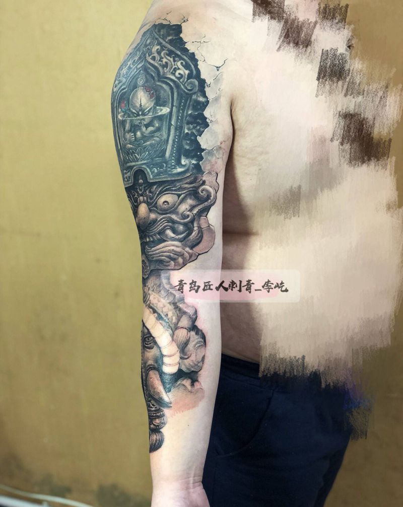 当前位置: 首页 >山东省青岛市纹身店-匠人刺青纹身图案>旧图衔接接花臂纹身图片_手臂欧美写实新传统石雕纹身图案