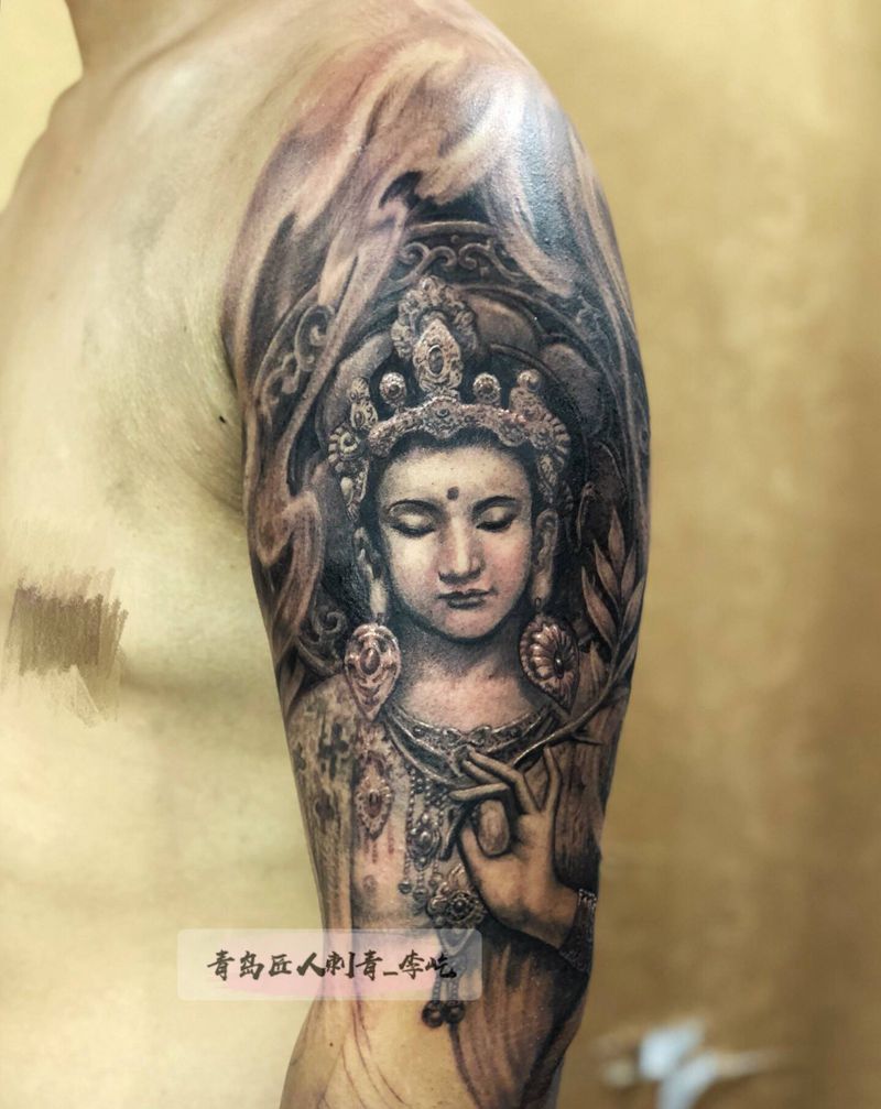 绿度母花臂 未完成纹身图片_手臂臀部欧美写实新传统绿度母纹身图案