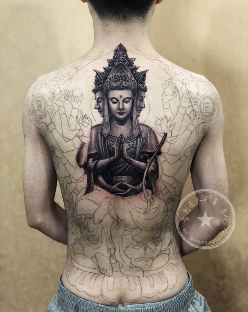 当前位置: 首页 >山东省青岛市纹身店-匠人刺青纹身图案>石雕千手观音纹身图片_背部欧美写实新传统千手观音石雕纹身图案