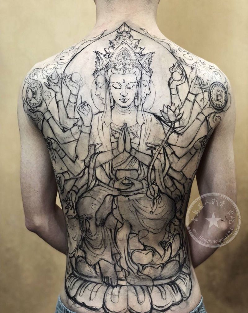 当前位置: 首页 >山东省青岛市纹身店-匠人刺青纹身图案>石雕千手观音纹身图片_背部欧美写实新传统千手观音石雕纹身图案