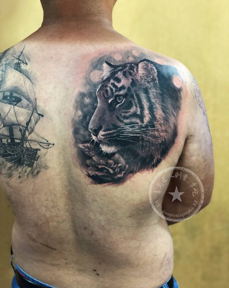 当前位置: 首页 >山东省青岛市纹身店-匠人刺青纹身图案>虎纹身图片_背部欧美写实老虎纹身图案