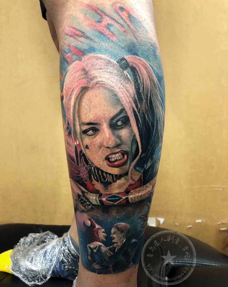 当前位置: 首页 >山东省青岛市纹身店-匠人刺青纹身图案>小腿彩色肖像 小丑女纹身图片_腿部欧美写实小丑女彩色肖像纹身图案