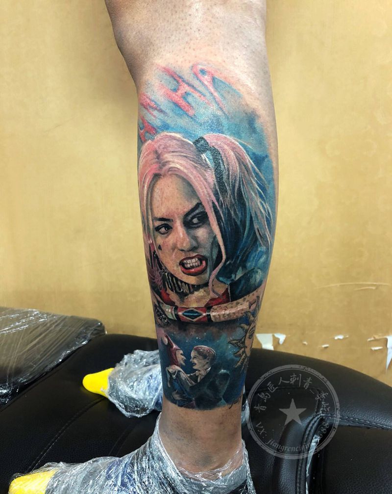 当前位置: 首页 >山东省青岛市纹身店-匠人刺青纹身图案>小腿彩色肖像 小丑女纹身图片_腿部欧美写实小丑女彩色肖像纹身图案