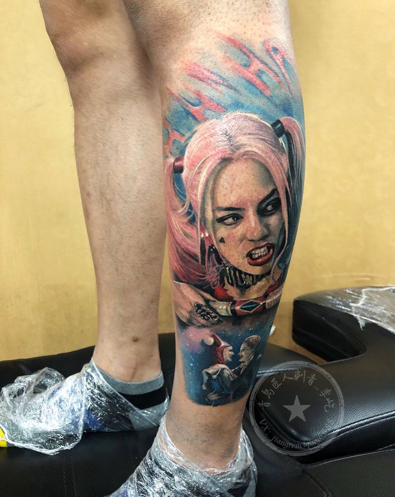 当前位置: 首页 >山东省青岛市纹身店-匠人刺青纹身图案>小腿彩色肖像 小丑女纹身图片_腿部欧美写实小丑女彩色肖像纹身图案