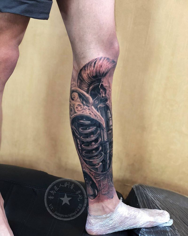 旧图遮盖机械小腿纹身图片_腿部欧美写实机械小腿遮盖纹身图案
