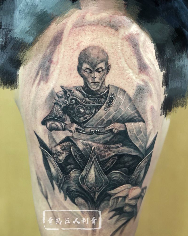 当前位置: 首页 >山东省青岛市纹身店-匠人刺青纹身图案>成佛 孙悟空纹身图片_腿部欧美写实孙悟空斗战胜佛纹身图案