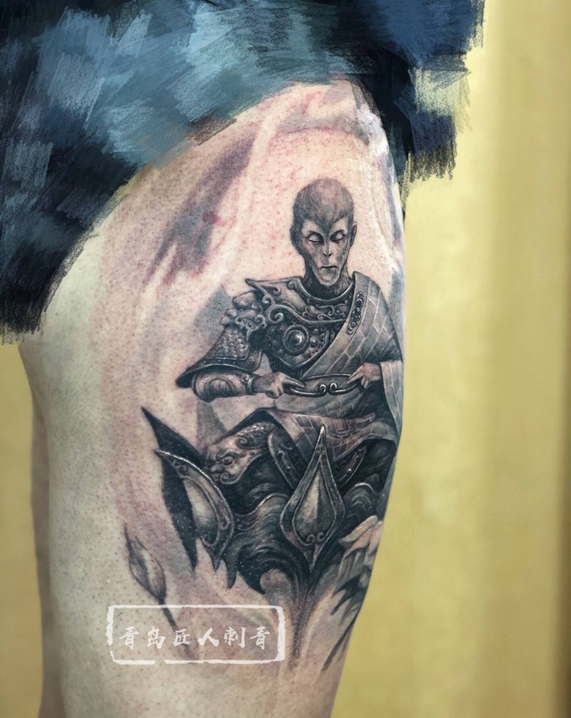 成佛 孙悟空纹身图片_腿部欧美写实孙悟空斗战胜佛纹身图案