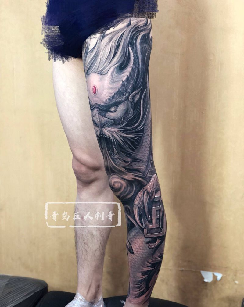 • T网红王老大花腿龙纹身图片_腿部新传统纹身图案