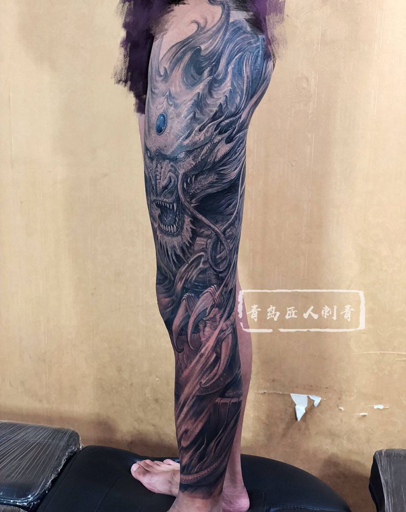 • T网红王老大花腿龙纹身图片_腿部新传统纹身图案