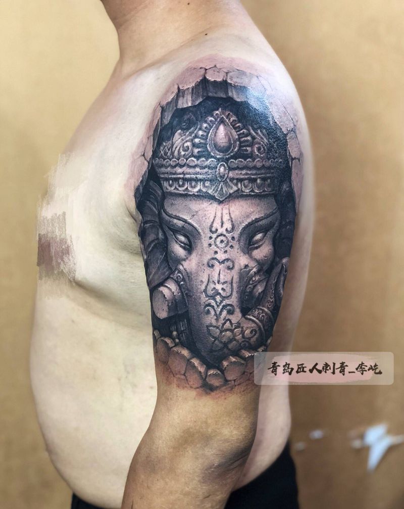 石雕象神纹身图片_手臂新传统欧美写实象神纹身图案