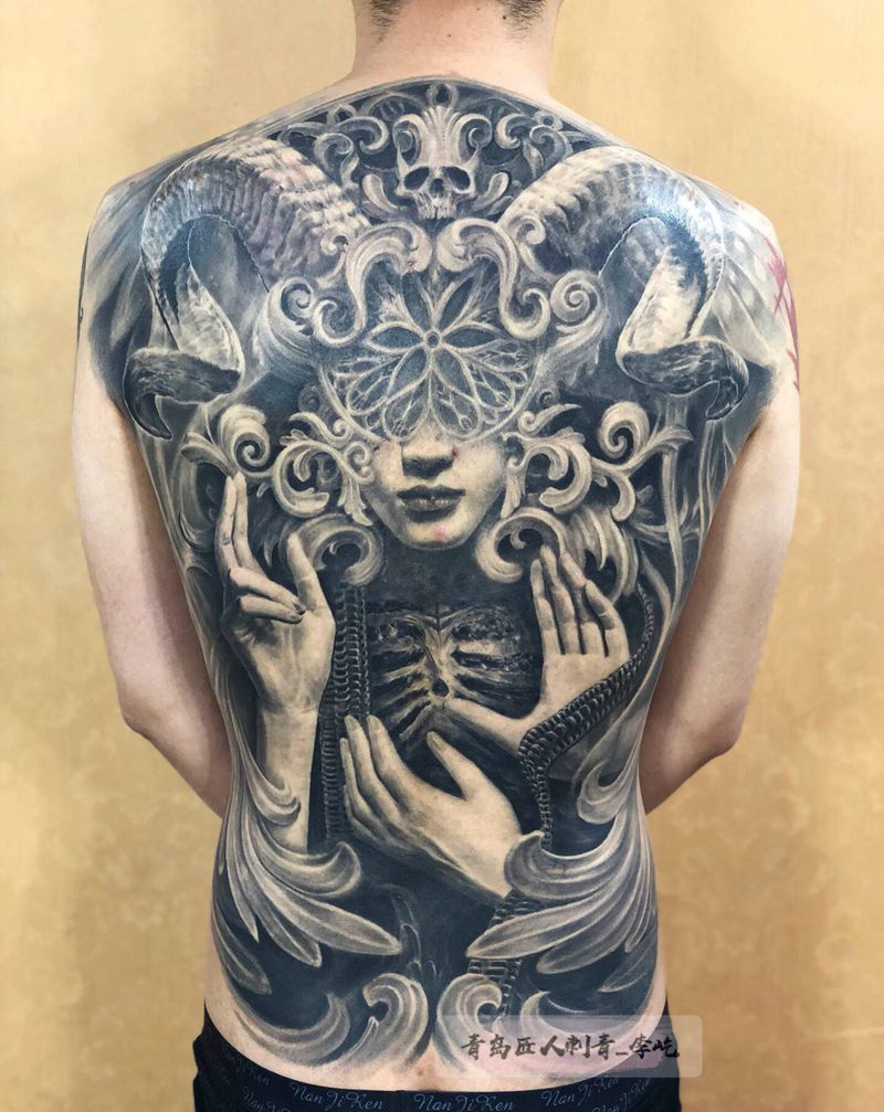 黑灰满背纹身图案