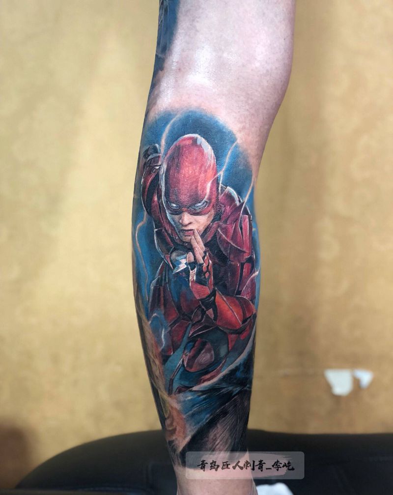 dc花腿 闪电侠纹身图片_腿部新传统欧美写实闪电侠蝙蝠侠纹身图案