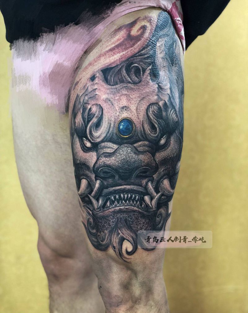 当前位置: 首页 >山东省青岛市纹身店-匠人刺青纹身图案>大腿龙头纹身图片_腿部新传统欧美写实龙纹身图案