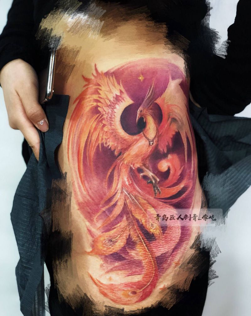 当前位置: 首页 >山东省青岛市纹身店-匠人刺青纹身图案>彩色凤凰纹身图片_腿部新传统欧美写实凤凰彩色纹身图案