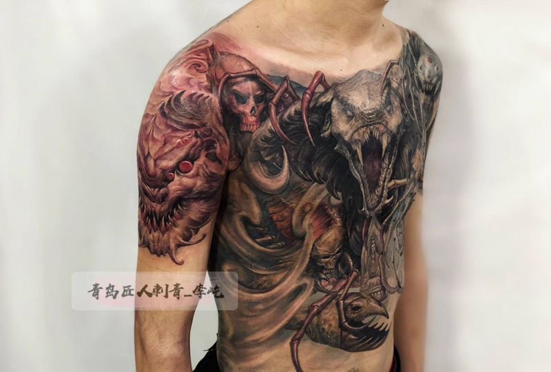 当前位置: 首页 >山东省青岛市纹身店-匠人刺青纹身图案>五毒纹身图片_胸部肩部新传统欧美写实五毒蛇纹身图案