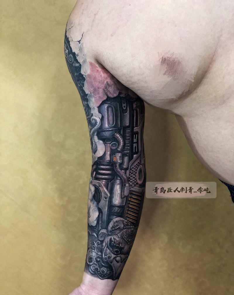 石雕机械臂纹身图片_手臂新传统欧美写实石雕机械纹身图案