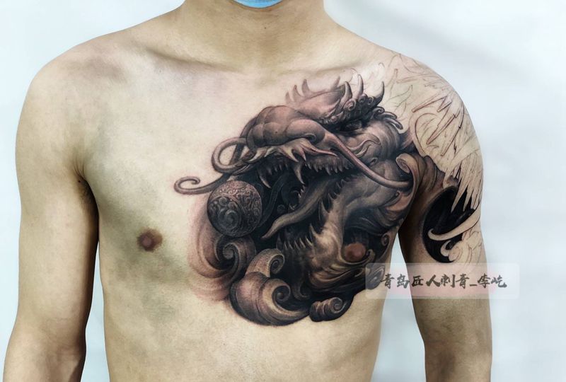 当前位置: 首页 >山东省青岛市纹身店-匠人刺青纹身图案>石雕龙 半甲龙纹身图片_胸部手臂欧美写实新传统龙石雕纹身图案